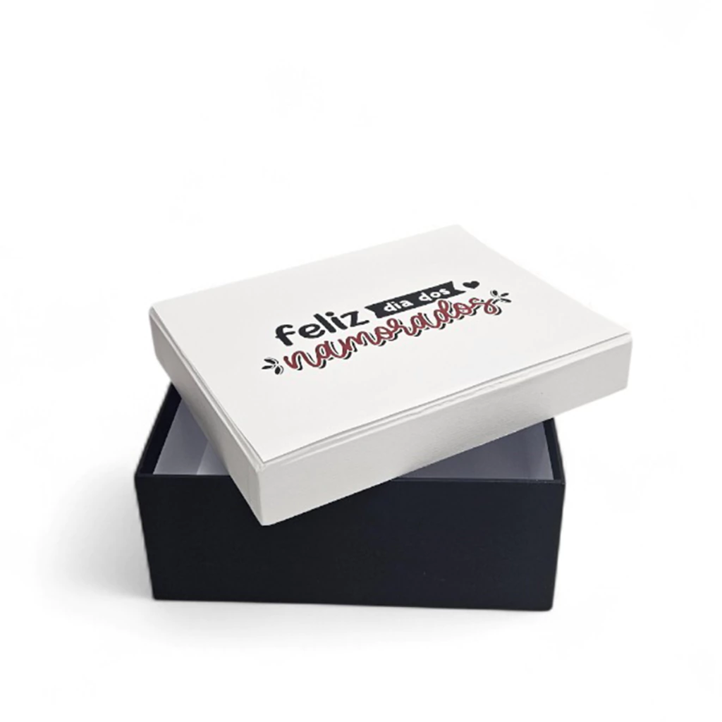 - Material: papelão rígido, 2 mm de espessura na base e tampa;